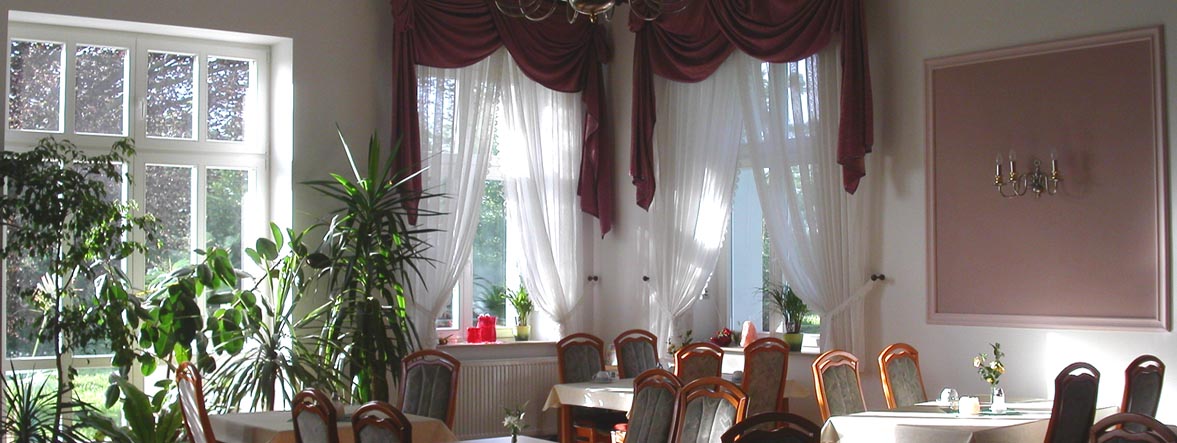 Der Saal mit Blick auf unseren angrenzenden kleinen Park sorgt für einen angenehmen Start in den Tag. Der Gesellschaftsraum und das Jagdzimmer runden das Bild ab. Unsere Räumlichkeiten bieten ein schönes Ambiente für Veranstaltungen jeder Art (Liederabende, Buchlesungen).